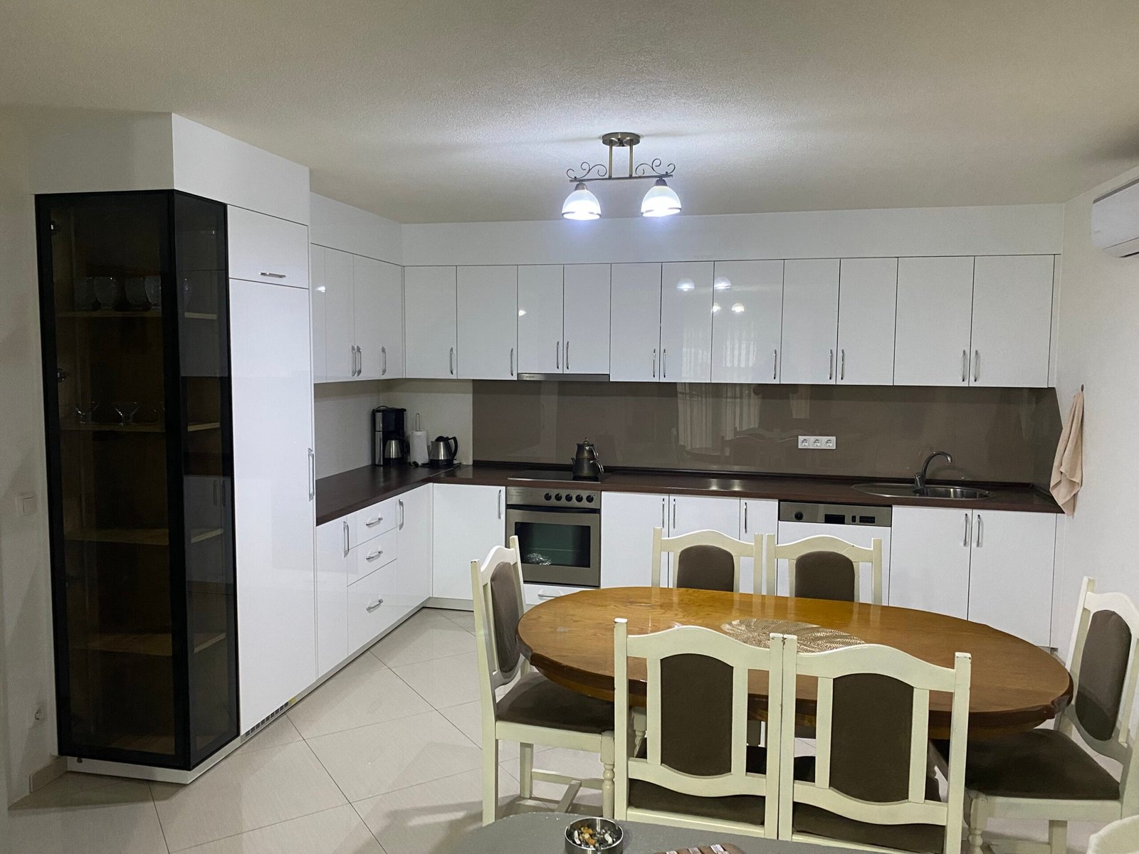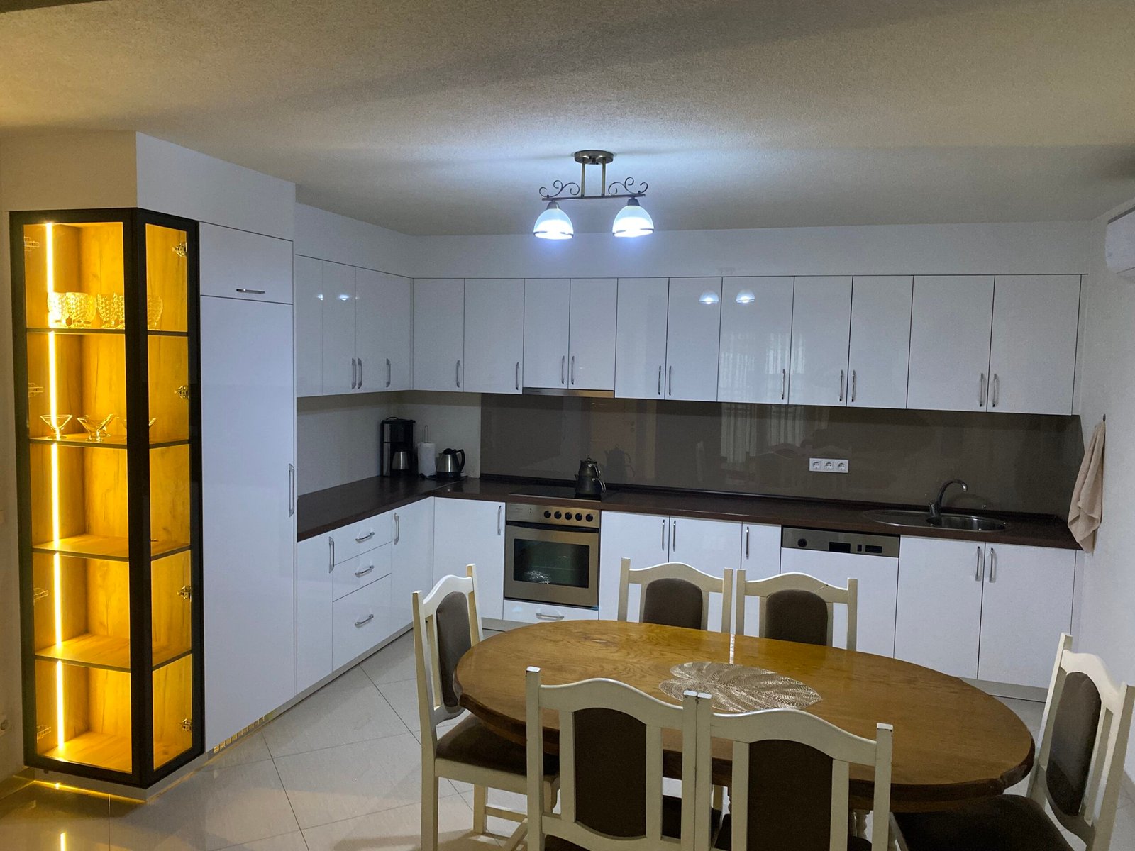 Kjo kuzhinë prezanton një gërshetim mes stilit modern të mobilimit dhe elementeve tradicionale të ngrënies, duke krijuar një ambient praktik dhe mikpritës.